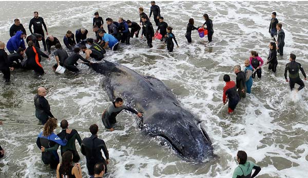 Los rescatistas cavaban en torno a la ballena para removerla y le tiraban agua además de cubrirla con telas mojadas para favorecer su hidratación. Asimismo trataban de construir con una pala mecánica un doble canal para izarla cuando suba la marea.