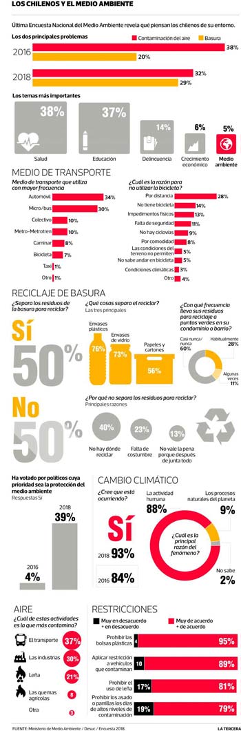 La medición, que se realizó entre el 8 de enero y el 5 de febrero pasado, y que se aplicó a 7.601 personas de 113 comunas del país, indica que la contaminación del aire lidera la lista de los problemas que los chilenos perciben que más lo afectan, con un 32% de las menciones; de cerca le sigue la basura, con un 29%. Sin embargo, la inquietud por la polución se redujo un 6,3% respecto de la última medición en 2016, cuando marcó 38,3%, mientras que la preocupación por la basura, que era de un 20,7% hace dos años, subió 8,3% en 2018.