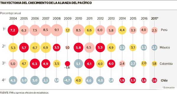 El desempeño de la Alianza del Pacífico (AP) se vio resentido en todos sus frentes al año pasado, ya que si bien Chile repitió hasta el momento su crecimiento más bajo desde 2009, en el caso de Colombia (1,8%) también implica su menor dinamismo desde la crisis financiera internacional de dicho año.