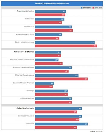 Mientras que las principales debilidades del país, se encuentran en la salud y educación primaria, la innovación, la sofisticación de los negocios y la eficiencia del mercado laboral.