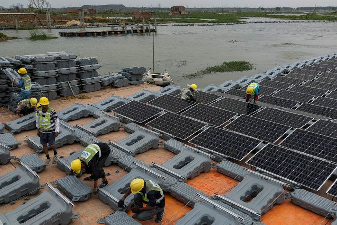 Ahora, en ese lago se encuentra en marcha el proyecto de generación de energía con páneles solares flotantes de Sungrow. Yang, de 57 años, conecta los tubos de plástico que contienen los cables de conexión para los páneles.