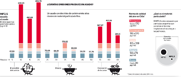 El año pasado, el investigador Héctor Jorquera, de la UC, señaló que 50 mil asados pueden llegar a emitir el 8,3% de la contaminación promedio de un día en la capital.