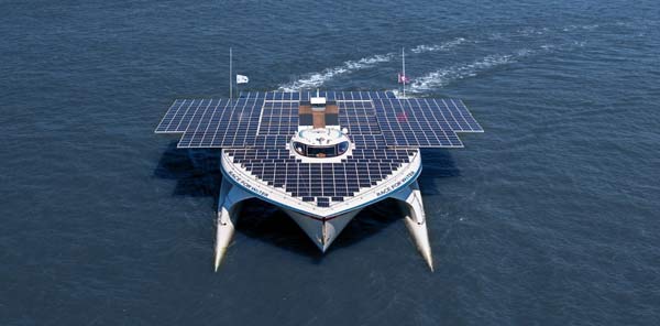 Está equipado con 512 metros cúbicos de paneles solares distribuidos en la cubierta superior y en dos alas extraíbles, que le hacen parecer una nave espacial fotovoltaica que surca los mares.