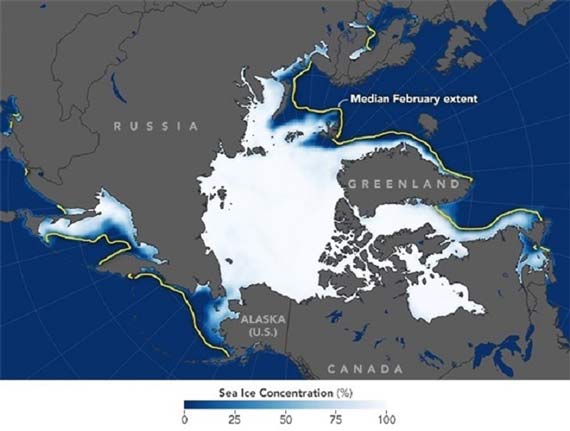 La extensión de febrero promedió 13,95 millones de kilómetros cuadrados, según el Centro Nacional de Datos de Nieve y Hielo. Eso es 1,35 millones de kilómetros cuadrados por debajo del promedio de 1981-2010 para febrero.