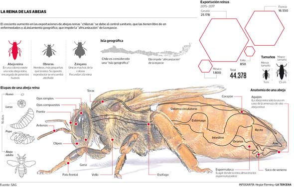Este fenómeno es el que llevó a países como Canadá, Francia, México e Italia a mirar hacia Chile en busca de abejas reinas: un mercado que sólo en los últimos tres años se ha duplicado en nuestro país, pasando de un poco más de 10 mil abejas reinas exportadas en 2015, a más de 20 mil en 2017.