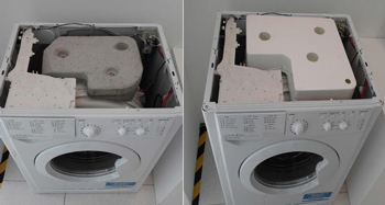 Mediante el uso de un contrapeso de plástico hueco lleno de agua, las lavadoras ya no vibran durante los ciclos de centrifugado. En la actualidad, los fabricantes utilizan bloques de hormigón que pesan más de 25 kg, para evitar este efecto, pero esto aumenta el peso y consecuentemente, también las emisiones del transporte.