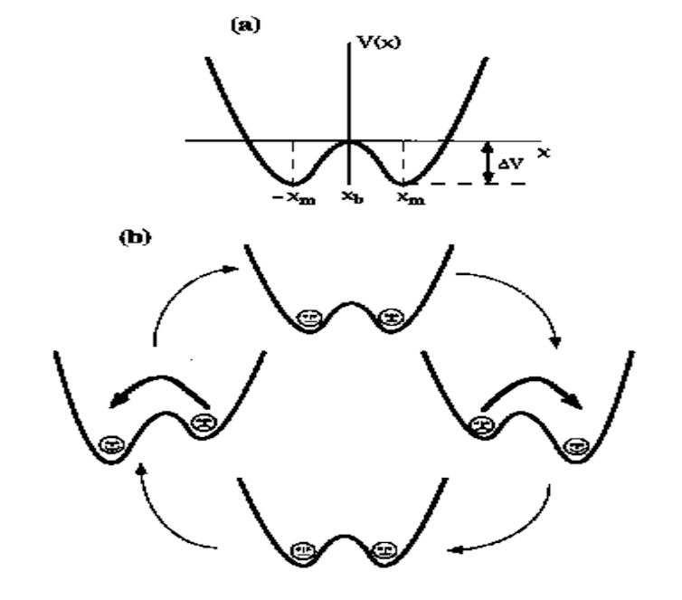 Digamos que la parábola de la izquierda representa la Tierra cubierta de hielo y la de la derecha, libre del mismo. Podemos representar las oscilaciones glaciares como una bola que va ascendiendo por uno de los lados hasta llegar al vértice. Por lo general vuelve hacia el valle, pero a veces la bola llega hasta el vértice y se desliza hacia la derecha. Entonces, el sistema cambia de estado.