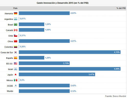 Como aparece en el gráfico de más abajo, Chile es uno de los países de la OCDE que menos gasta en Innovación y Desarrollo y está lejos de Isarael y Corea, que son los lugares con el gasto más alto del mundo y unos de los países más tecnologizados del planeta.