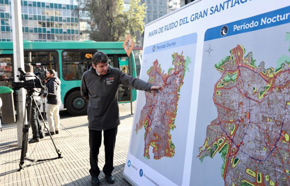 El Gran Santiago urbano cuenta hoy con un nuevo y actualizado mapa del ruido diurno y nocturno, desarrollado por el Ministerio del Medio Ambiente (MMA). Se trata de una representación gráfica de la contaminación acústica, de una zona determinada, ciudad, región, comuna, barrio, etc-, que permite reconocer la distribución espacial y temporal de este contaminante invisible en la capital. Este mapa muestra que más de 1.219.837 de santiaguinos (19%), están expuestos a altos niveles de ruido diurno y alrededor de 1.870.000 (29%) de contaminación acústica nocturna.