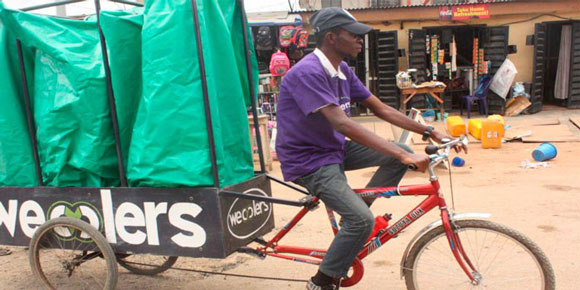 Es un modelo de negocio donde “todos ganan”. Una flota de ciclistas pedalea en un gran triciclo fabricado a medida, de puerta en puerta cada semana, por calles estrechas y sin pavimentar, por donde los camiones no pueden acceder fácilmente, pesando y recogiendo residuos reciclables procedentes de los hogares registrados en el programa. Los miembros reciben puntos por cada kilo de residuos reciclado, que pueden intercambiar por bienes. “Ayudamos a nuestros abonados a ahorrar, utilizando sus residuos para comprar las cosas que quieren tener. Esto podría ser un televisor, una máquina de coser o incluso dinero en efectivo, muy necesario para financiar un matrimonio”, dice la directora general y fundadora de Wecyclers, Bilikiss Adebiyi-Abiola.