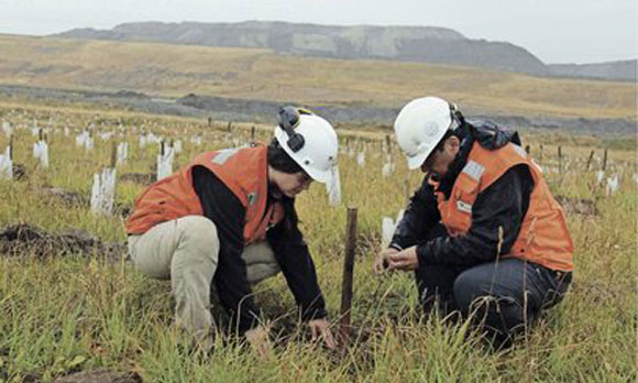 En Mina Invierno, en la Región de Magallanes: La nueva vegetación cubre sectores que fueron botaderos de material extraído para el inicio de las faenas, hace cuatro años.