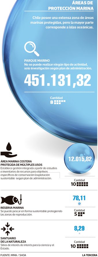 Con la creación en 2015 del parque marino Nazca-Desventuradas, con más de 300 mil km2 protegidos, Chile sumó 463.233.6 km2 de área marina protegidos y pasó ese 10%, aunque según un grupo de ONG, se trata sólo de un tipo de ecosistema. El 99,7% de estas áreas están alrededor de las islas oceánicas, de gran importancia, pues en ellas hay especies únicas, pero de poco impacto en ecosistemas más cercanos a la gente común.