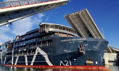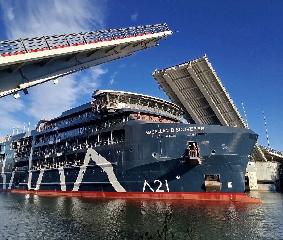 El Magellan Discoverer completó con éxito su paso por el rio Calle Calle, en una etapa previa a sus pruebas en mar abierto. La embarcación de 94 metros de largo, construida por ASENAV con ingeniería 100% valdiviana para Antarctica21, exigió un complejo basculamiento del Puente Cau Cau para cruzar bajo el viaducto.