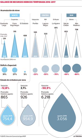 Las cifras corresponden al recurso contenido en embalses hasta el mes de agosto y la variación que hubo respecto del promedio histórico acumulado hasta ese mes. Sumando todos los promedios registrados en la zona sur, y comparado con los millones de metros cúbicos estancados en los ocho meses de 2016, se evidencia un déficit de un 51%. El más afectado fue Laja, que pasó de tener un promedio de 3.202 millones de metros cúbicos (m3) como registro histórico, a 878 millones de m3 este año. La zona norte, que corresponde a la infraestructura de acopio entre Atacama y Coquimbo, tuvo un 12% menos, mientras que en el centro del país -que contempla la RM, Valparaíso y O’Higgins, la acumulación de agua en 2016 subió un 3,1%.